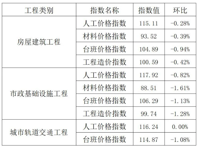 现发布我省房屋建筑工程、市政基础设施工程和城市轨道交通工程2024年9月人工价格指数和台班价格指数;以及房屋建筑工程和市政基础设施工程材料价格指数和工程造价指数如下: